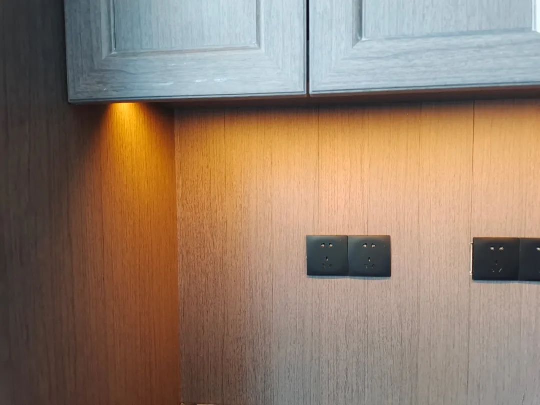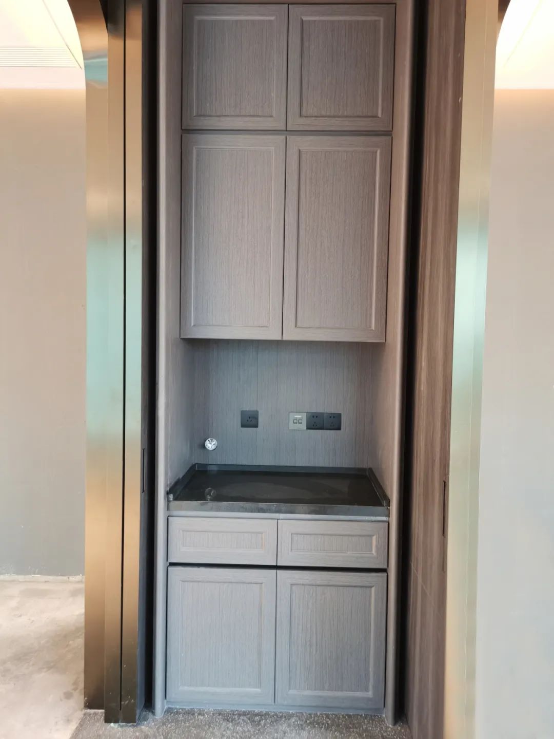 柜門設(shè)計的是隱形免拉手,一來防止開關(guān)夾傷,二來隱藏式設(shè)計顏值和實用并存,由此可見設(shè)計師的心思細(xì)膩。