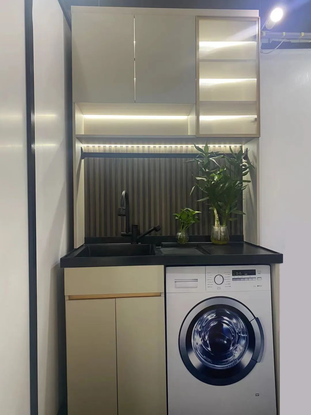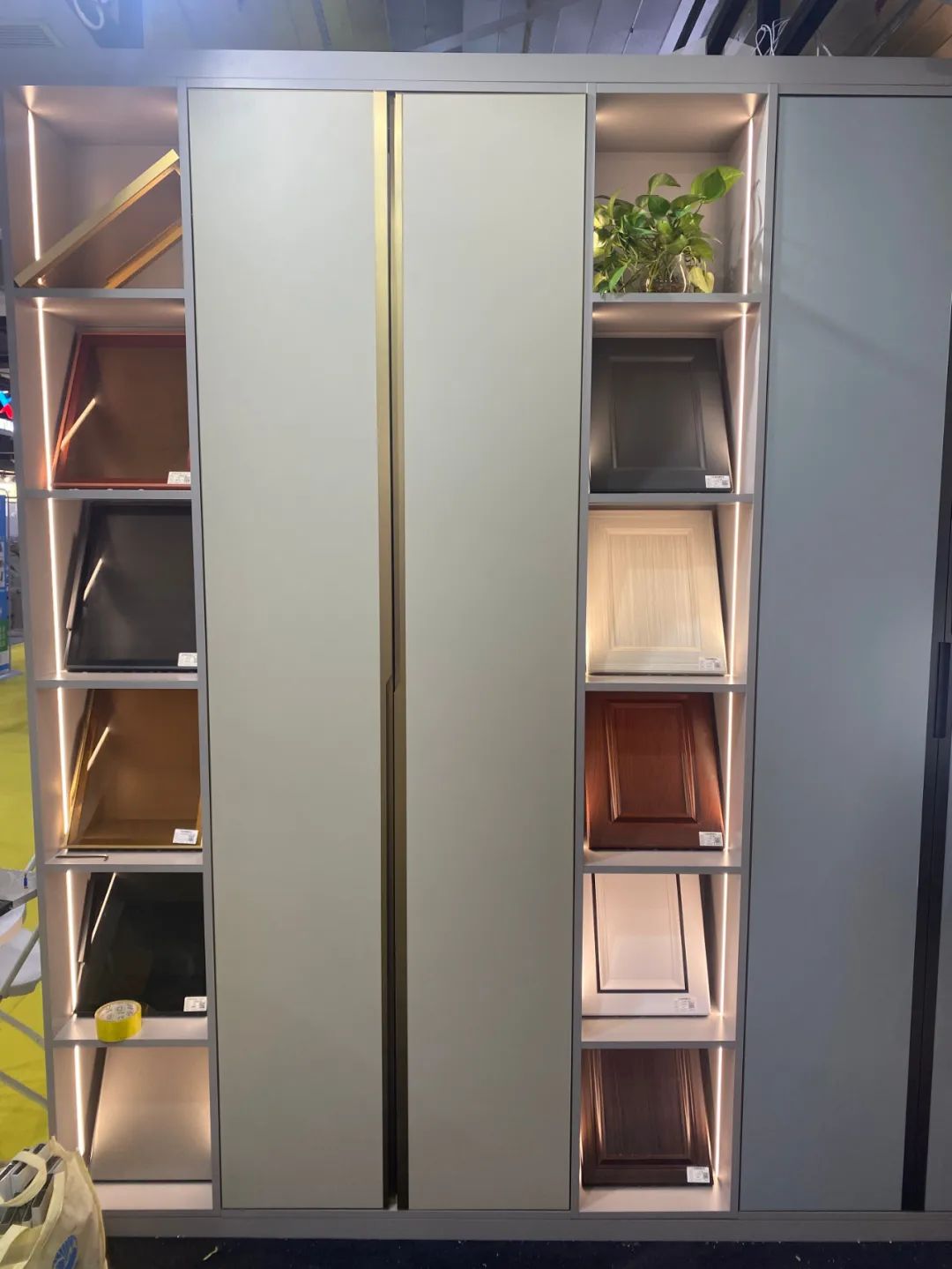 儲(chǔ)物柜體選色來(lái)自新研發(fā)莫蘭迪系列膚感淺灰大板,鋁型材用的是航空板,耐用、抗壓不變形。中間擺放的是各種顏色的門芯和柜門板材,柜體中的燈帶照在門板上,暖與簡(jiǎn)、色與色的包容碰撞,解鎖高級(jí)美感。
