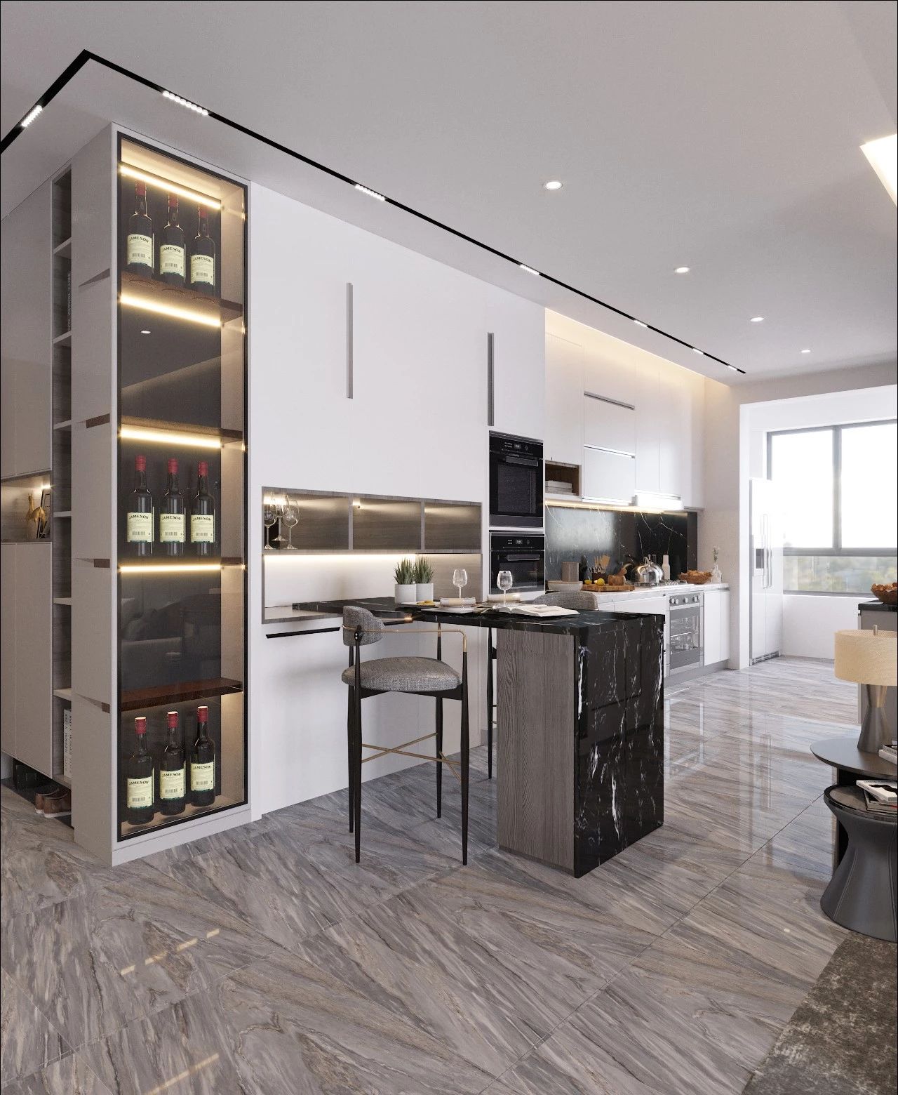 L型吧臺餐邊柜:半開放設計,吧臺就餐,吃下午茶,精致美好。即能緩解廚房空間及功能的壓力,又滿足收納需求的同時,顏值也是狠狠愛住了。