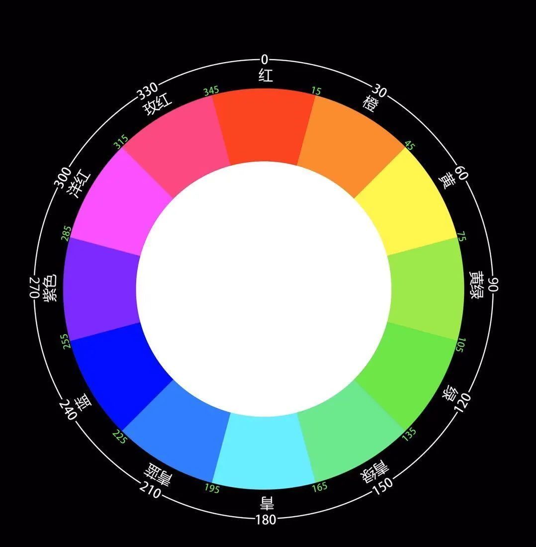 除了黑、白、灰三種無彩色,任何色彩都有色相。設(shè)計常用到的色相環(huán)就是最直觀的表達。