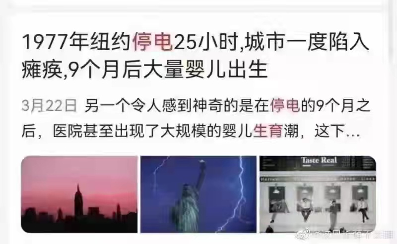 7、第一,東北正在下一盤大棋,用限電的方式,解決東北生育率過低的問題。因?yàn)閾?jù)說,1977年紐約停電25小時(shí),9個(gè)月后大量嬰兒出生。所以,限電是為了提高東北生育率。