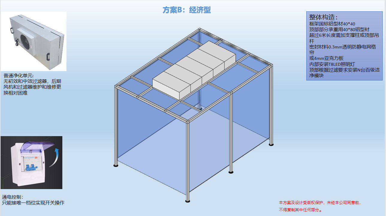 燈具:內部采用凈化室專用凈化燈,不產(chǎn)塵,滿足潔凈棚內的照明需求。