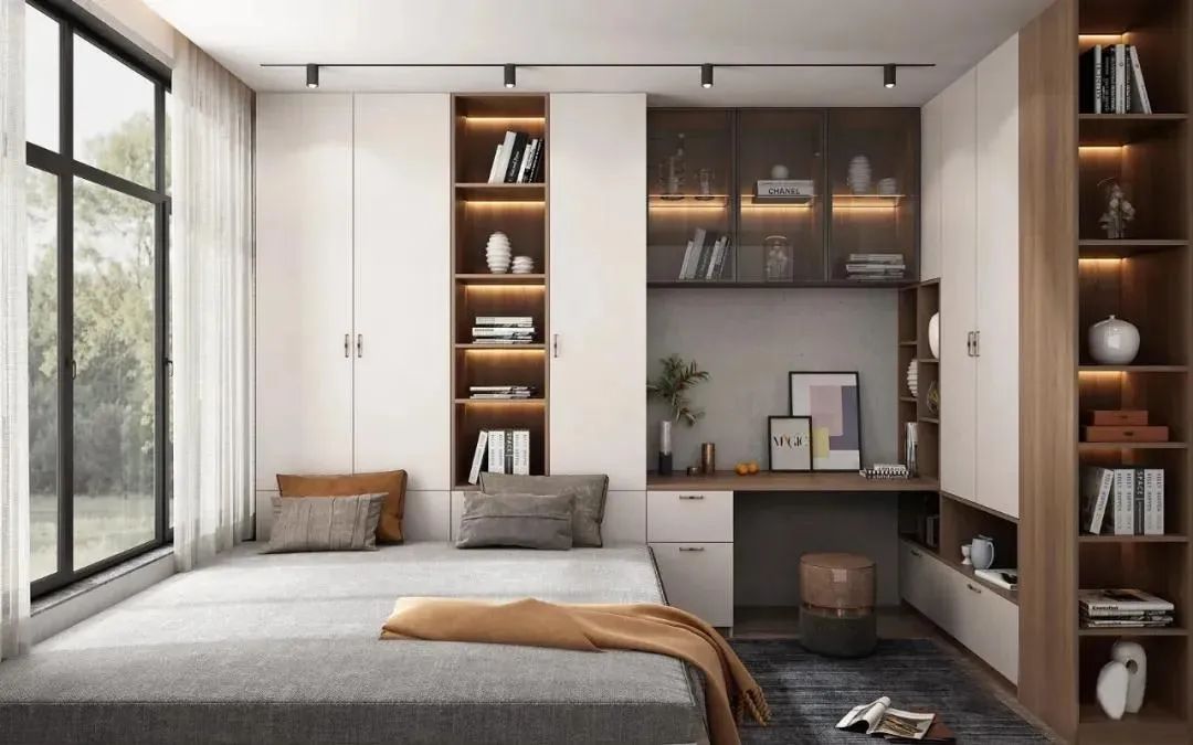 整個房間由床+全鋁床頭柜+全鋁書桌+全鋁衣柜組成,亮點(diǎn)是圍繞床頭背景打造成整墻柜,上方吊柜和下方矮柜都可以用來收納雜物,中間的開放格可以用來放書,滿足一間房的所有收納需求!
