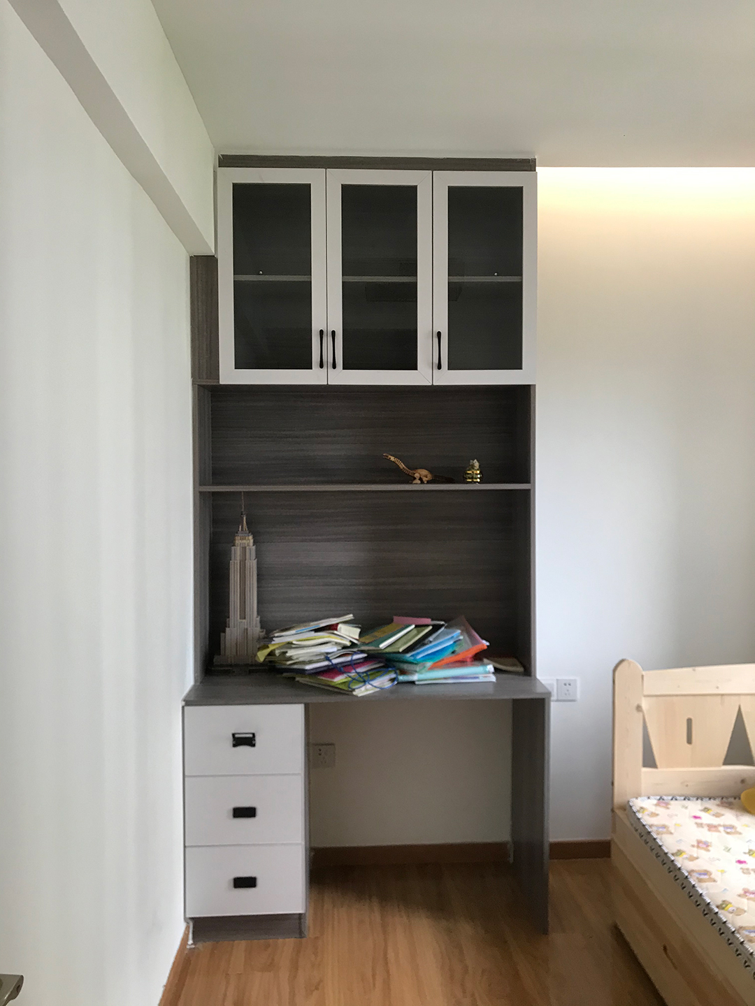 書柜+寫字臺(tái)書桌是學(xué)齡期兒童房必備,書桌上方可以做上隔板或吊柜,增添儲(chǔ)物能力,書桌的一邊加上柜子。書桌上方的吊柜,可以選擇用玻璃柜門,既可以避免落灰的問題,想要拿東西的時(shí)候,也更容易找到。