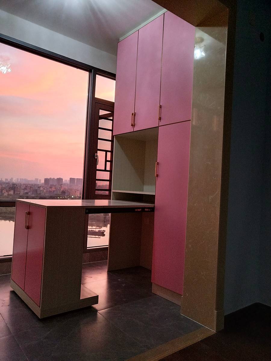 在陽臺(tái)也可以考慮做折疊款書桌,在陽臺(tái)邊寫作業(yè)辦公,光線好,夜晚的時(shí)候還可以泡杯茶看夜景,平時(shí)不用的時(shí)候,可以把書桌給藏進(jìn)柜子里,讓陽臺(tái)看起來更整潔寬敞。