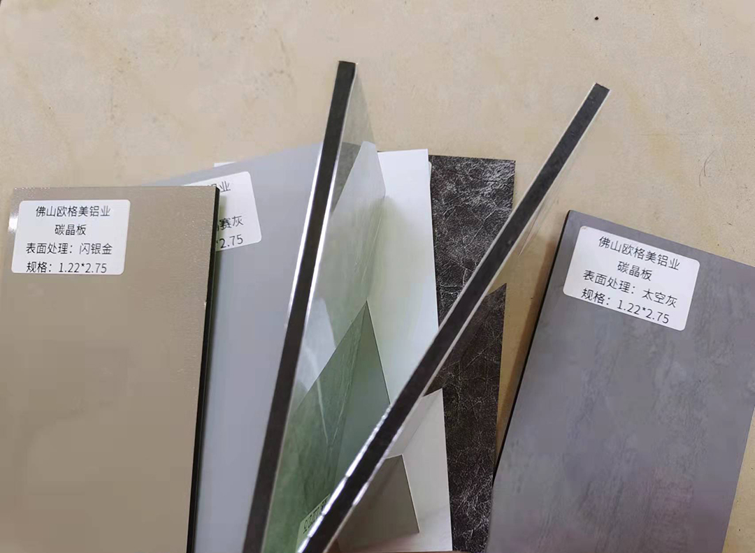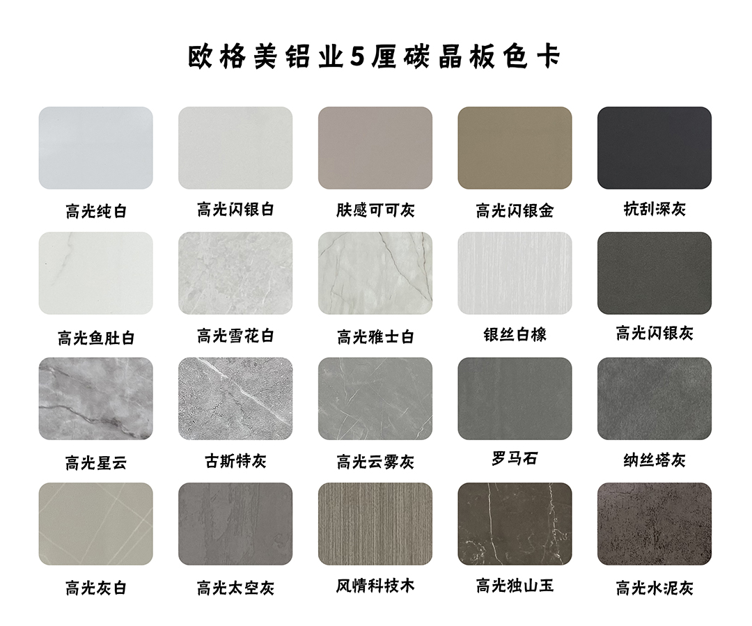 歐格美碳晶集成板有5mm和18mm厚兩種,規(guī)格是1.22*2.75米,目前庫存有20種顏色,包裝是5張起批。