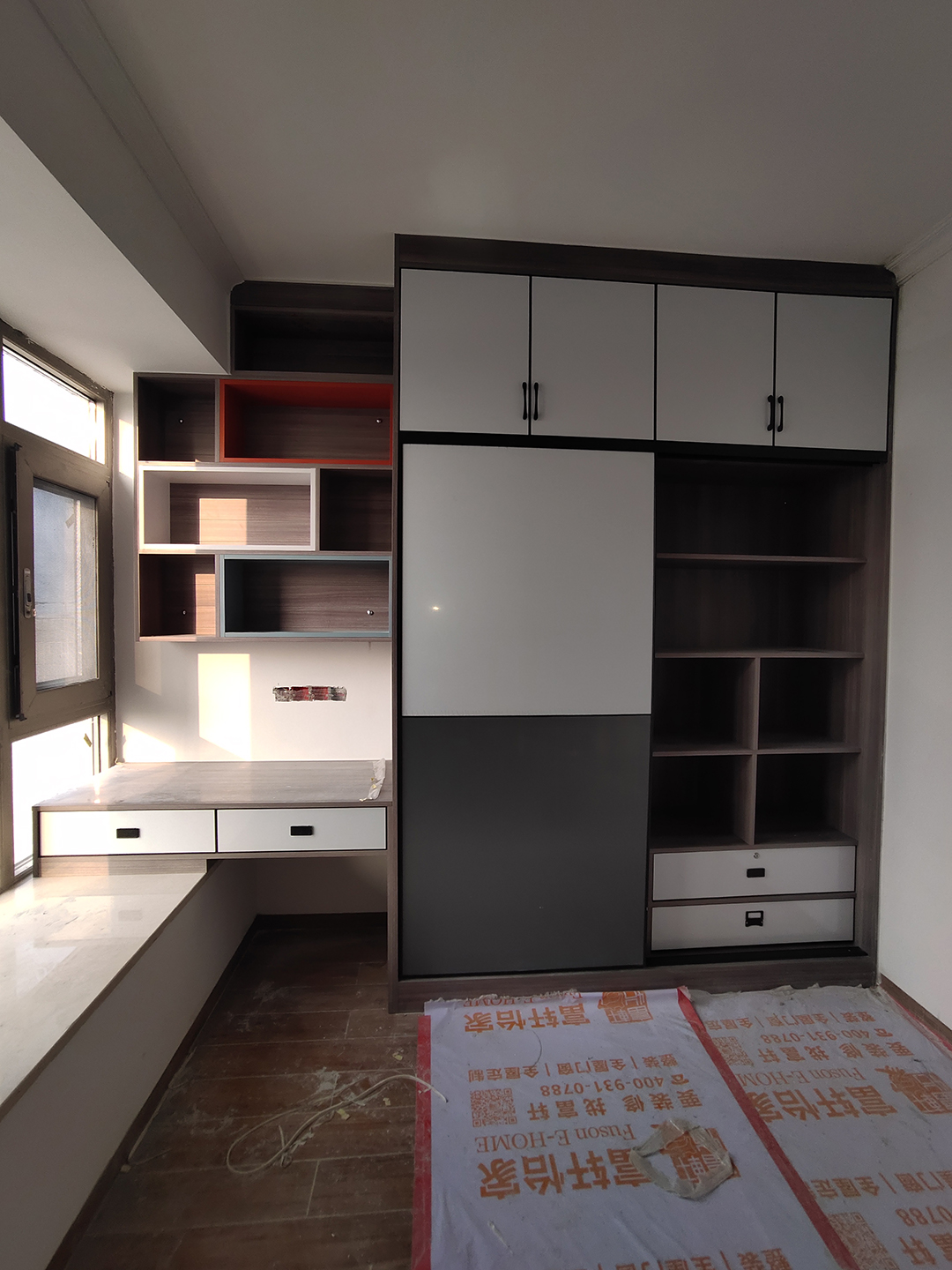 兒子房利用飄窗墊高定制了書桌柜+衣柜組合,衣柜也是做的上掩門下移門結(jié)構(gòu),書桌吊柜做的是開(kāi)放式層板,用肌膚藍(lán)、天使白和愛(ài)馬仕橙三種顏色做了三個(gè)錯(cuò)位套格做造型,層次感就上來(lái)了。