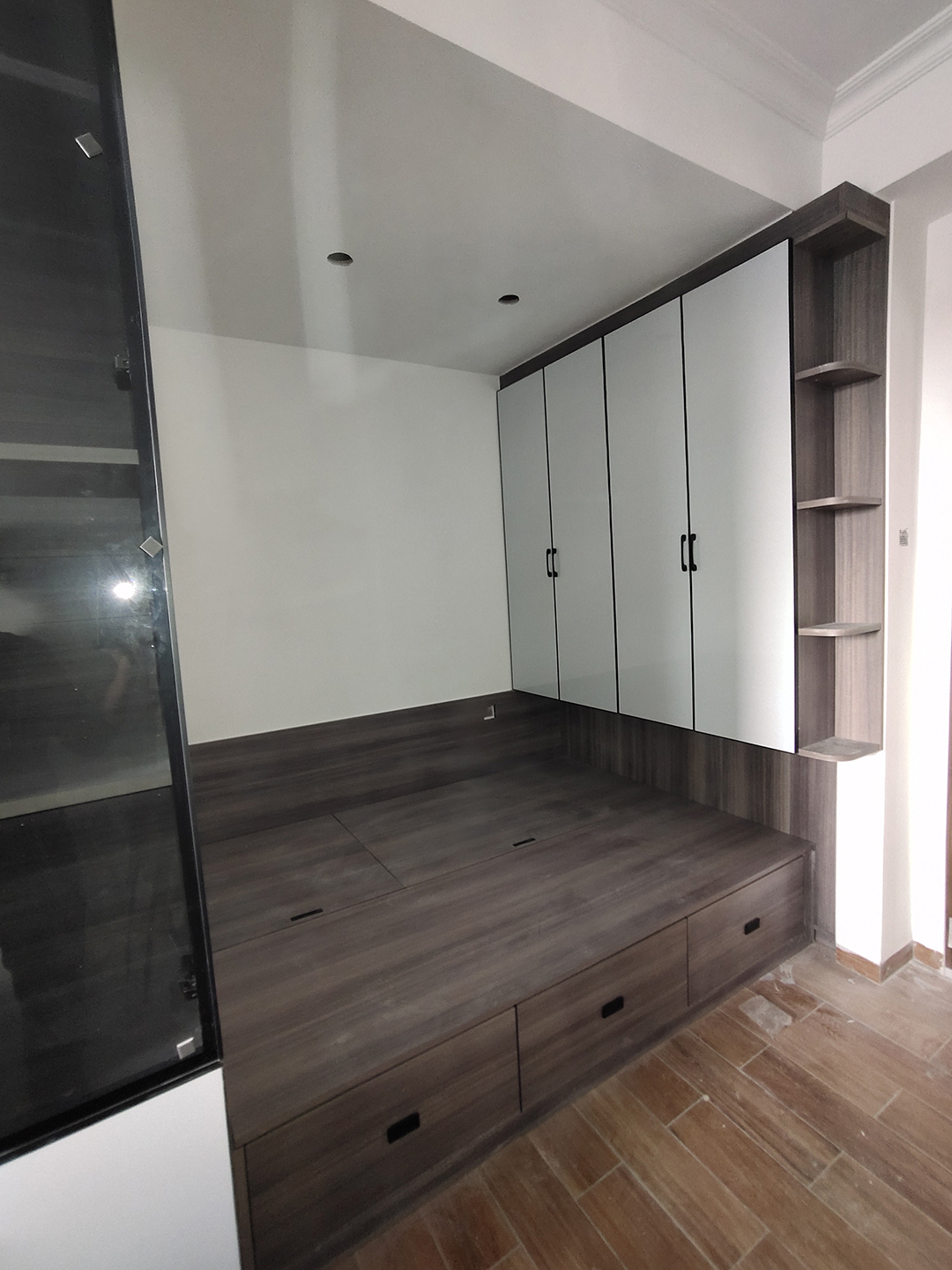 女兒房做了玻璃門儲(chǔ)物柜+榻榻米床+衣柜組合,榻榻米床沿一邊做了抽屜,內(nèi)部也可上翻打開(kāi),收納非常足,衣柜做成壁掛式吊柜,不占用床的空間,轉(zhuǎn)角圓弧設(shè)計(jì)不怕磕碰。