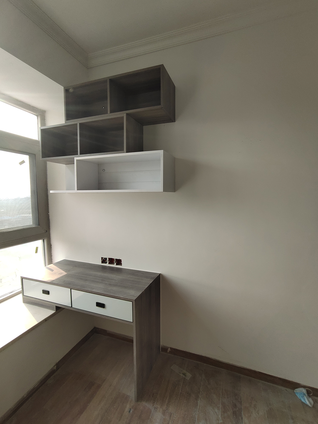 女兒房靠飄窗也做了一個(gè)書桌柜,與兒子房類似,飄窗墊高做成書桌,吊柜用北歐松木灰和天使白兩種顏色做成開(kāi)放式錯(cuò)位格,整體統(tǒng)一和諧,簡(jiǎn)單實(shí)用。