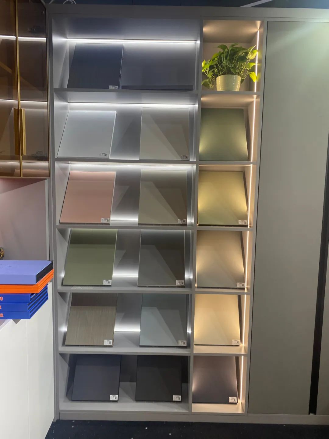 儲(chǔ)物柜體選色來(lái)自新研發(fā)莫蘭迪系列膚感淺灰大板,鋁型材用的是航空板,耐用、抗壓不變形。中間擺放的是各種顏色的門芯和柜門板材,柜體中的燈帶照在門板上,暖與簡(jiǎn)、色與色的包容碰撞,解鎖高級(jí)美感。