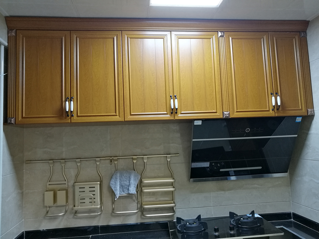也可以做這種木紋色系的全鋁吊柜和地柜,簡(jiǎn)單實(shí)用。廚房裝吊柜和地柜是小戶型的首選,充分利用空間!