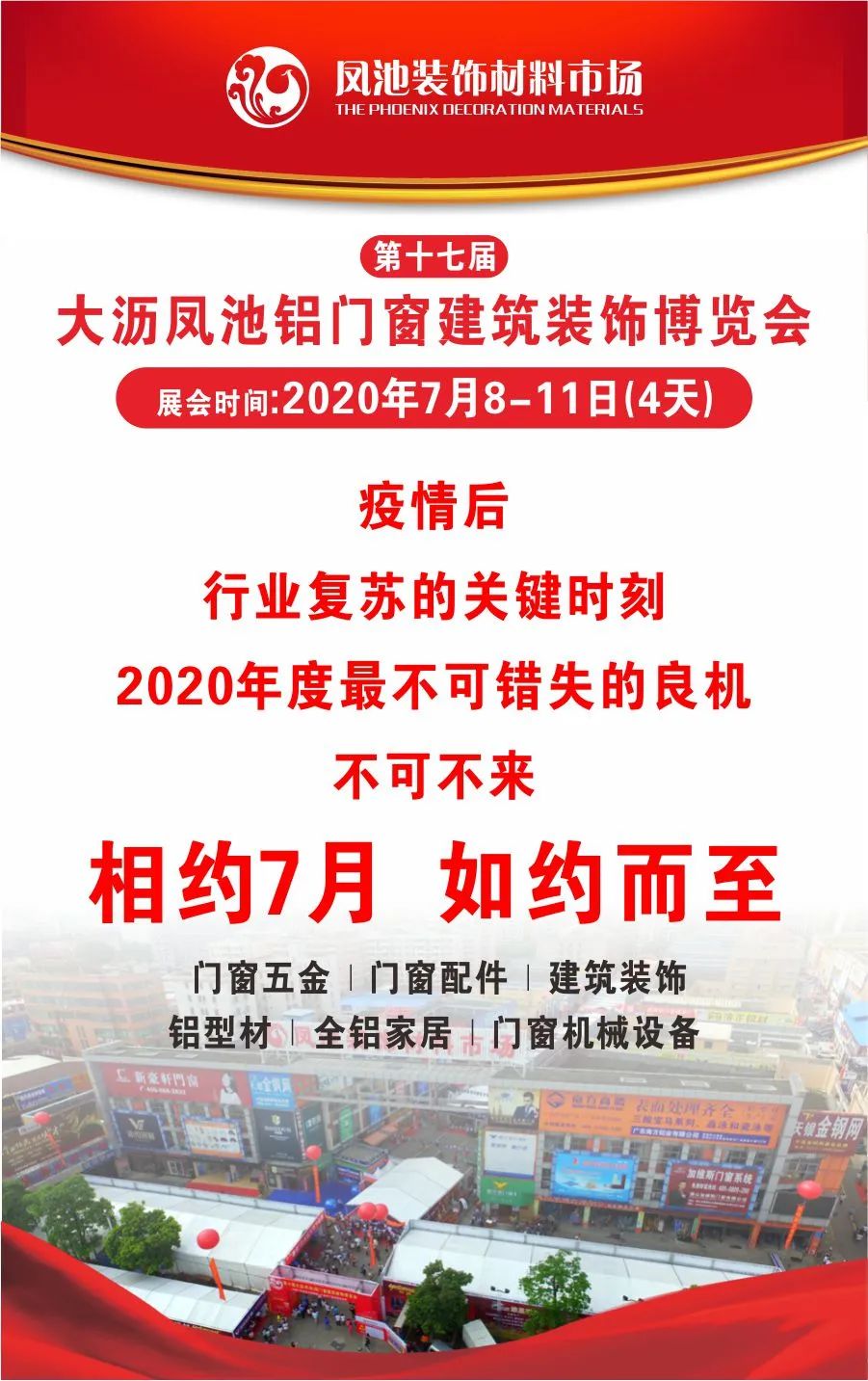 2020年7月大瀝鳳池展會(huì)主辦方(鳳池社區(qū)、鳳池經(jīng)聯(lián)社、鳳池裝飾材料市場(chǎng))和承辦方(佛山市南海銳覺(jué)展覽有限公司、佛山市南海區(qū)銳覺(jué)科技有限公司),經(jīng)大瀝鎮(zhèn)人民政府批準(zhǔn),旨在為后疫情時(shí)代,鋁產(chǎn)業(yè)廠商與經(jīng)銷(xiāo)商、產(chǎn)品與品牌搭建一個(gè)成果展示、洽談合作的相聚平臺(tái),為企業(yè)提供面向未來(lái)發(fā)展、尋找新機(jī)遇的良好氛圍,推動(dòng)“鋁產(chǎn)業(yè)”平穩(wěn)健康發(fā)展!